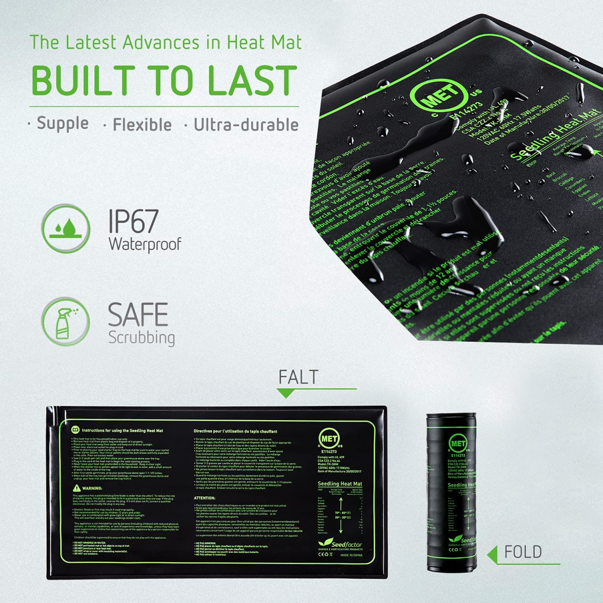 • The Seedfactor Seeding Heat Mat adopts the latest 7.5MM thickening,105 degrees of high temperature resistant cylindrical SJTW 5.9ft water-proof power cord (thicker than the general power cord, solid, high temperature resistant), safer and more durable, and guarantee the stability of seedling mat safety work.
